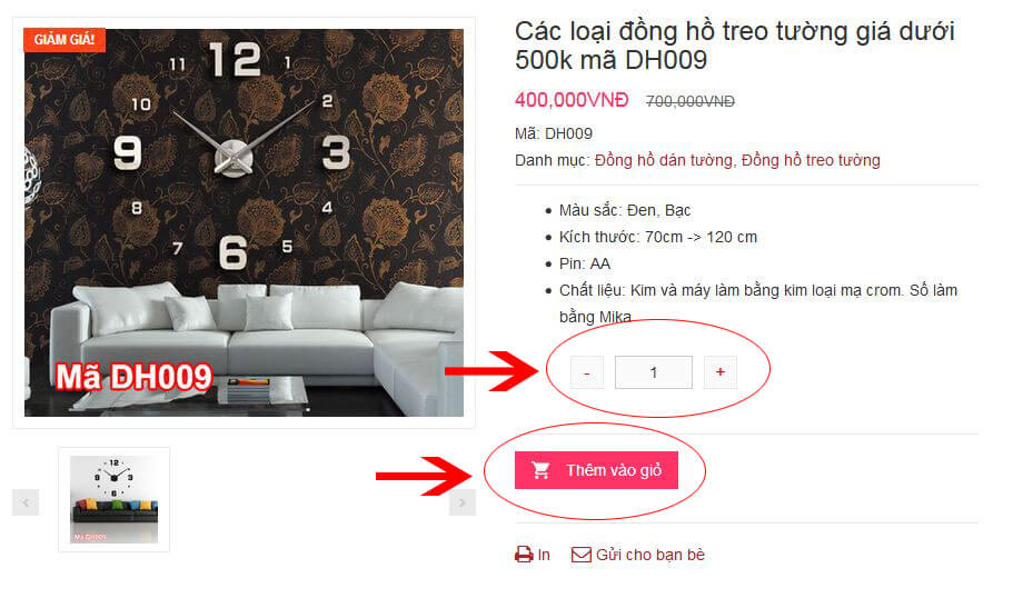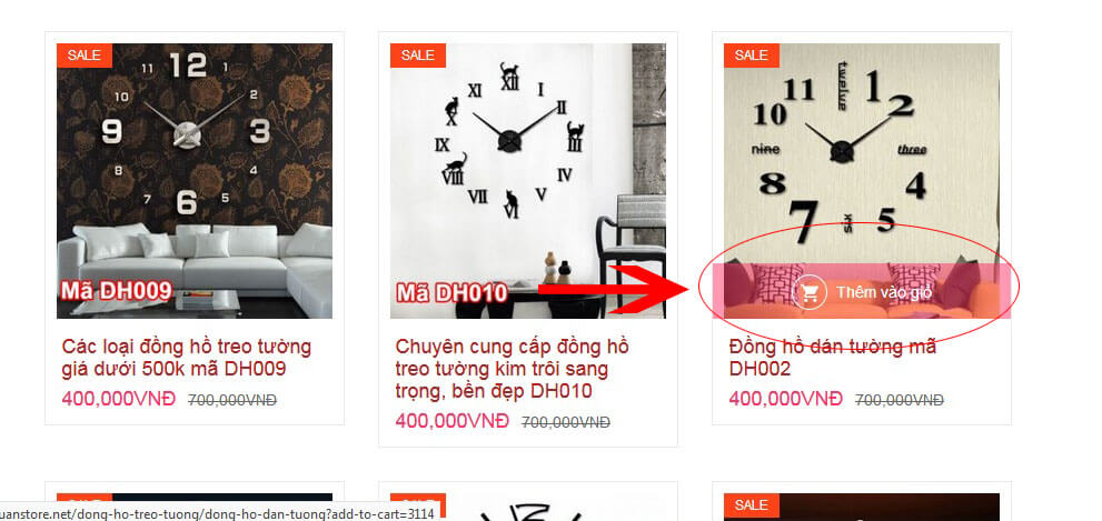 - Vào danh mục sản phẩm đồng hồ dán tường tại đây hoặc Đồng hồ treo tường trang trí Chọn sản phẩm ưng ý và ấn vào chữ “Thêm vào giỏ”
