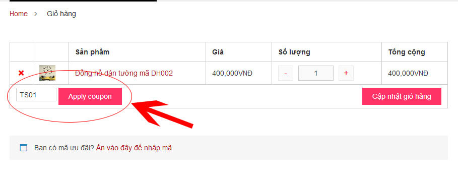 Bước 2: Nhập mã giảm giá (VD: TS01) và ấn vào nút “Apply coupon”