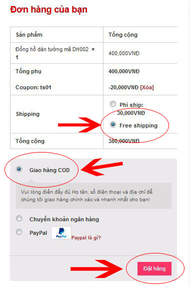 Bước 4: Kiểm tra thông tin đơn hàng lần cuối, và chọn “Free Shipping” để được miễn phí vận chuyển. Chọn phương thức nhận hàng là COD hoặc Chuyển khoản => Ấn nút “Đặt Hàng”