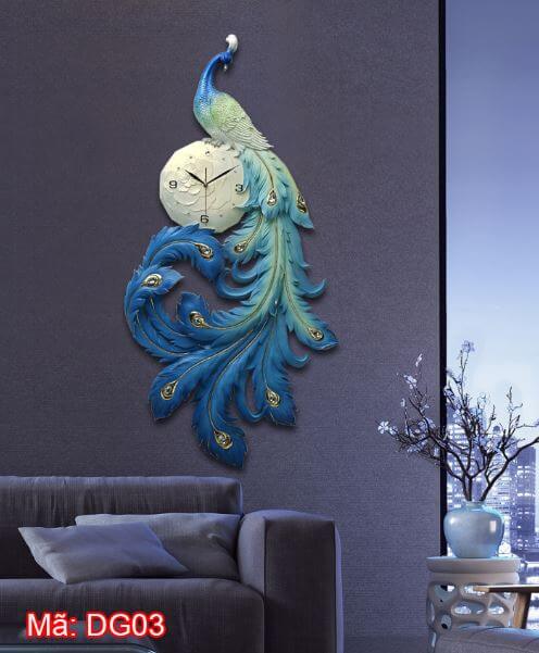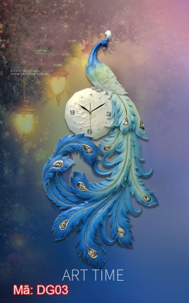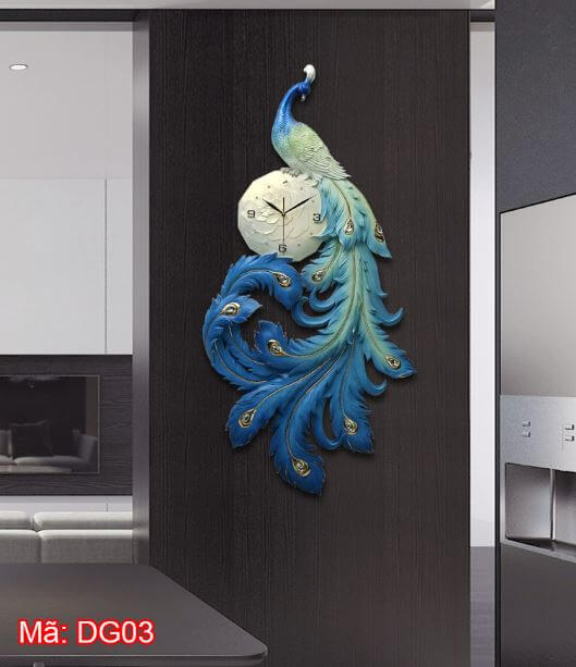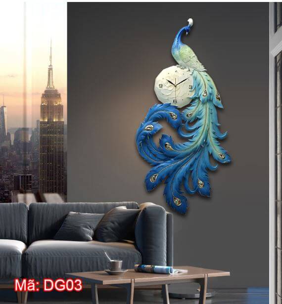 Trang trí nội thất hiện đại thì không thể thiếu chiếc đồng hồ trang trí nghệ thuật đẹp. Đồng hồ con công treo tường mã DG03 có kích thước 69x130cm được làm hoàn toàn bằng bột gốm đá cao cấp, với hai màu chủ đạo là màu xanh và trắng. Đây là mẫu đồng hồ được ưa chuộng nhất bới vẻ đẹp tinh xảo, và mang ý nghĩa phong thuỷ tốt lành.