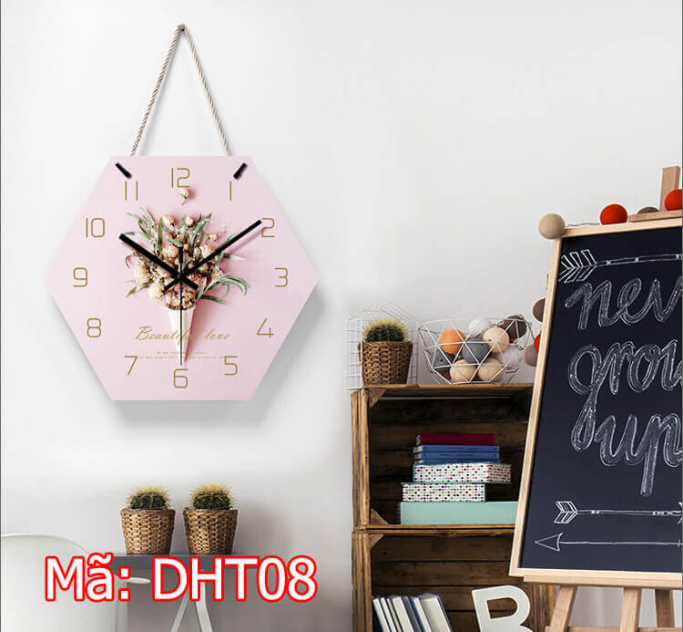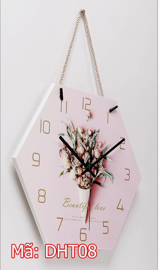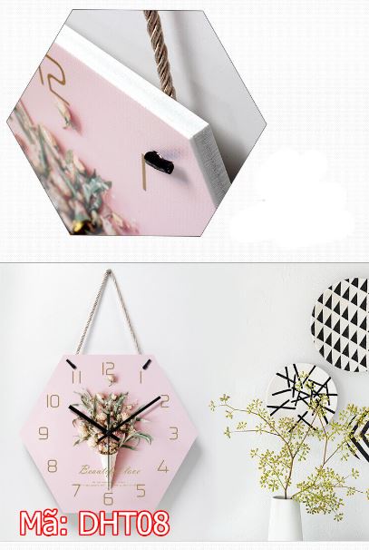 Nhìn vào hình ảnh các bạn có thể thấy DHT08 là mẫu đồng hồ treo tường siêu đẹp và bắt mắt. Đồng hồ có thiết kế lạ hình lục giác. Đi kèm theo đó là gam màu hồng đầy ấn tượng và siêu dễ thương.